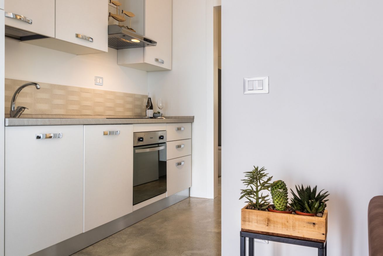 L’appartamento Alfa è composto da una camera matrimoniale, una cucina/soggiorno con divano letto ed un bagno con doccia.