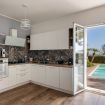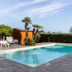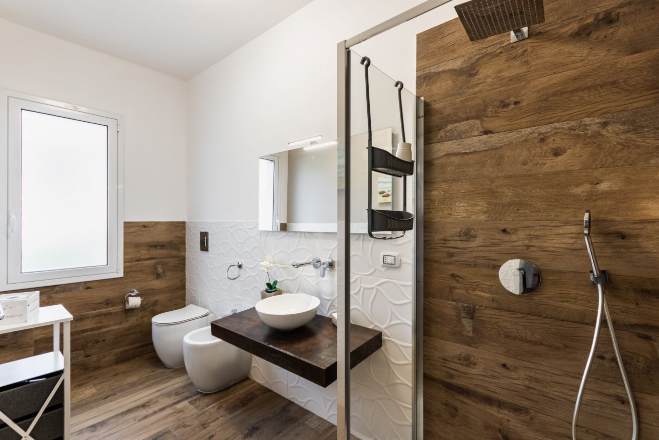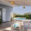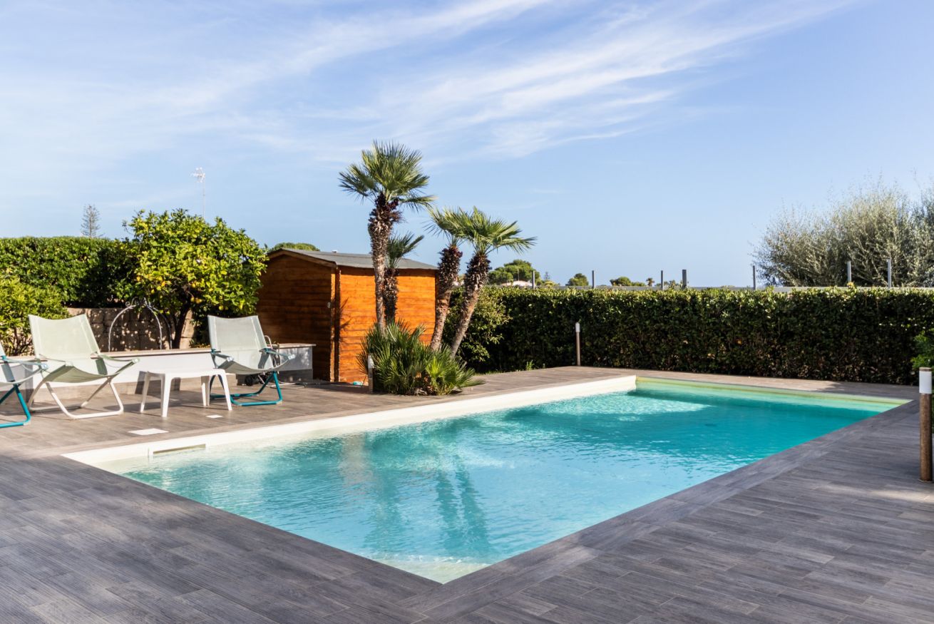 Dalla cucina si accede all’esterno, dove la piscina privata diventa il fulcro delle giornate estive. Il solarium è attrezzato con sdraio, ombrelloni e una pratica doccia all’aperto, ideale per rinfrescarsi al rientro dal mare. Separata dalla zona piscina e riparata da una tettoia, si trova l’area pranzo all’aperto con barbecue, perfetta per cene e aperitivi. Qui sono presenti anche comode poltrone, pensate per godersi l’ombra, leggere o conversare in totale relax. Una cucina di servizio con lavatrice e un bagno di cortesia completano il piano terra.