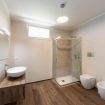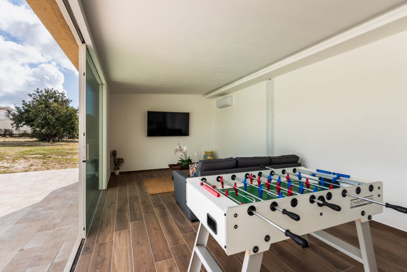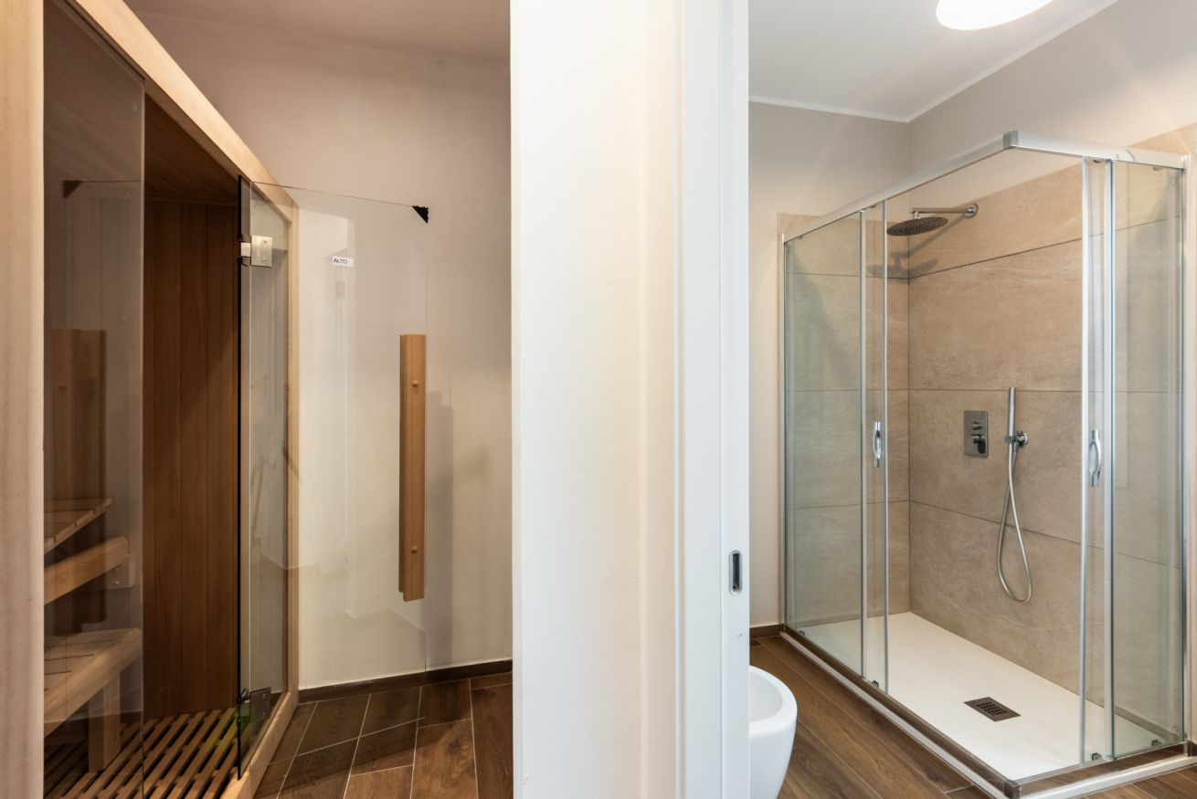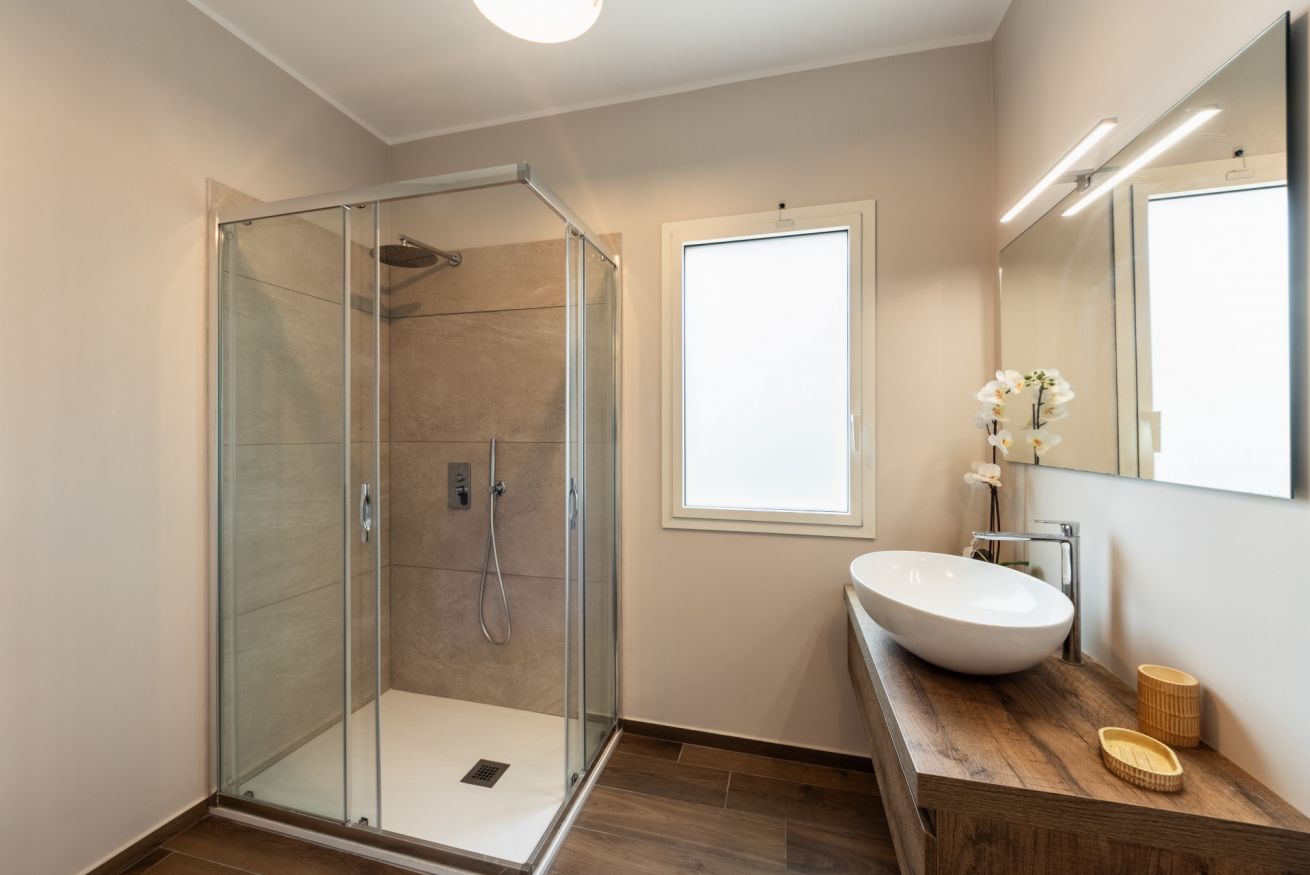 La villa offre interni eleganti e funzionali: una cucina attrezzata, con soppalco con divano letto matrimoniale; una camera da letto matrimoniale con soppalco con altri due letti singoli e bagno con doccia e sauna in camera; un ampio bagno in zona cucina, una zona living accogliente con grandi vetrate che si affacciano sulla zona piscina, una cucina attrezzata esterna. La veranda esterna coperta e la terrazza panoramica diventano veri e propri salotti all’aperto, ideali per cene sotto le stelle o momenti di relax immersi nel silenzio della natura.