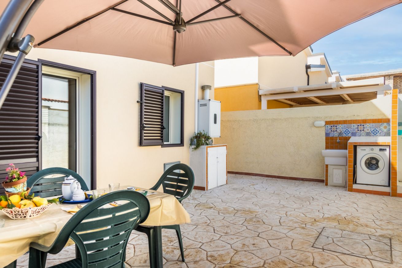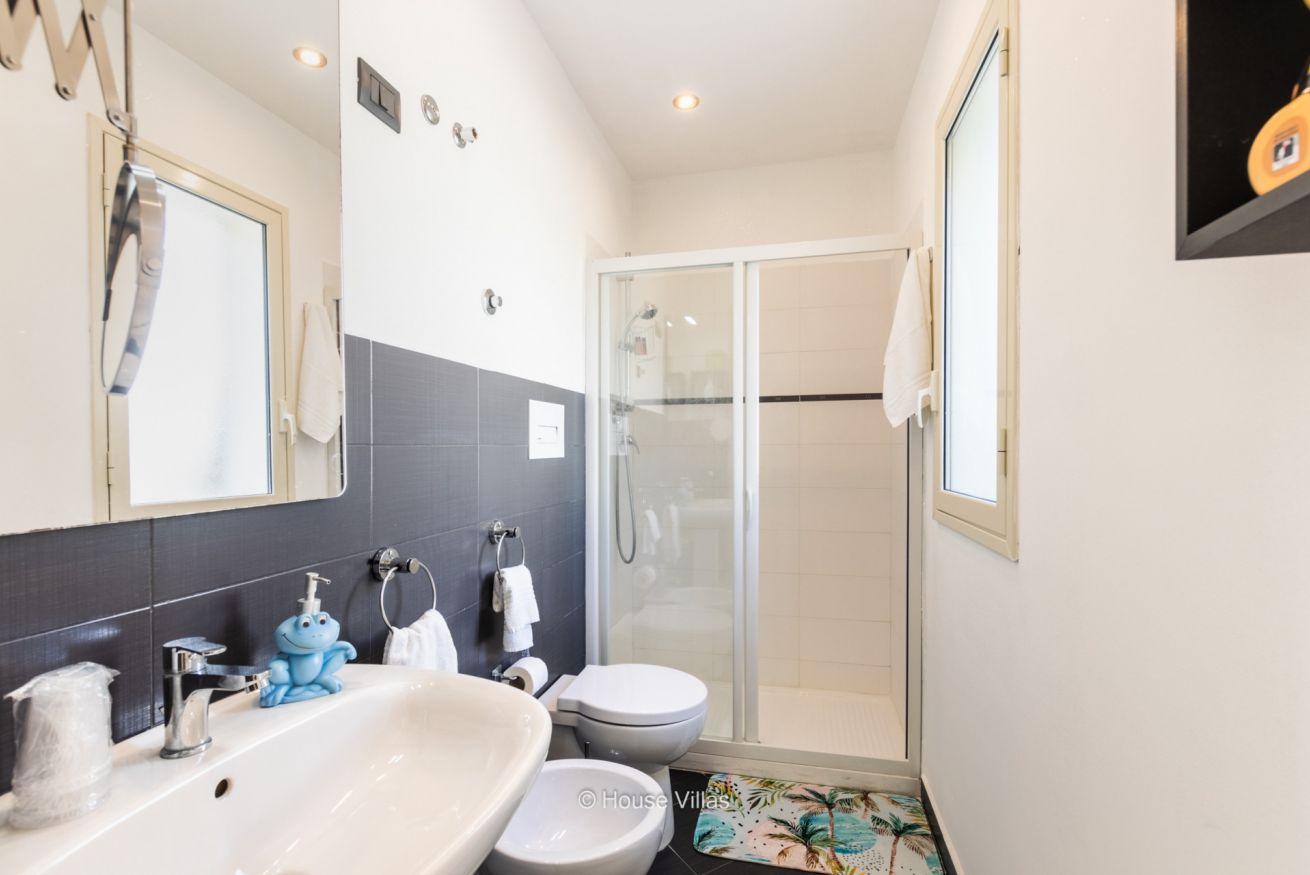 La villa dispone di ingresso indipendente con posto auto interno ed è composta da una camera matrimoniale, una camera doppia, una luminosa cucina/soggiorno, un bagno e una veranda attrezzata con zona pranzo esterna. Il giardino privato, arricchito da una comoda doccia esterna, è perfetto per rilassarsi dopo una giornata di mare.